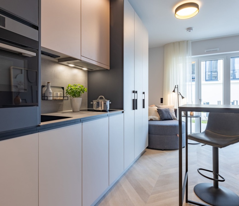 All Savvy flats have a high-quality equipped kitchen that leaves nothing to be desired. Thanks to the partly multifunctional furniture, such as the extendable dining table, it offers all the conveniences of a large kitchen – in a compact studio format.